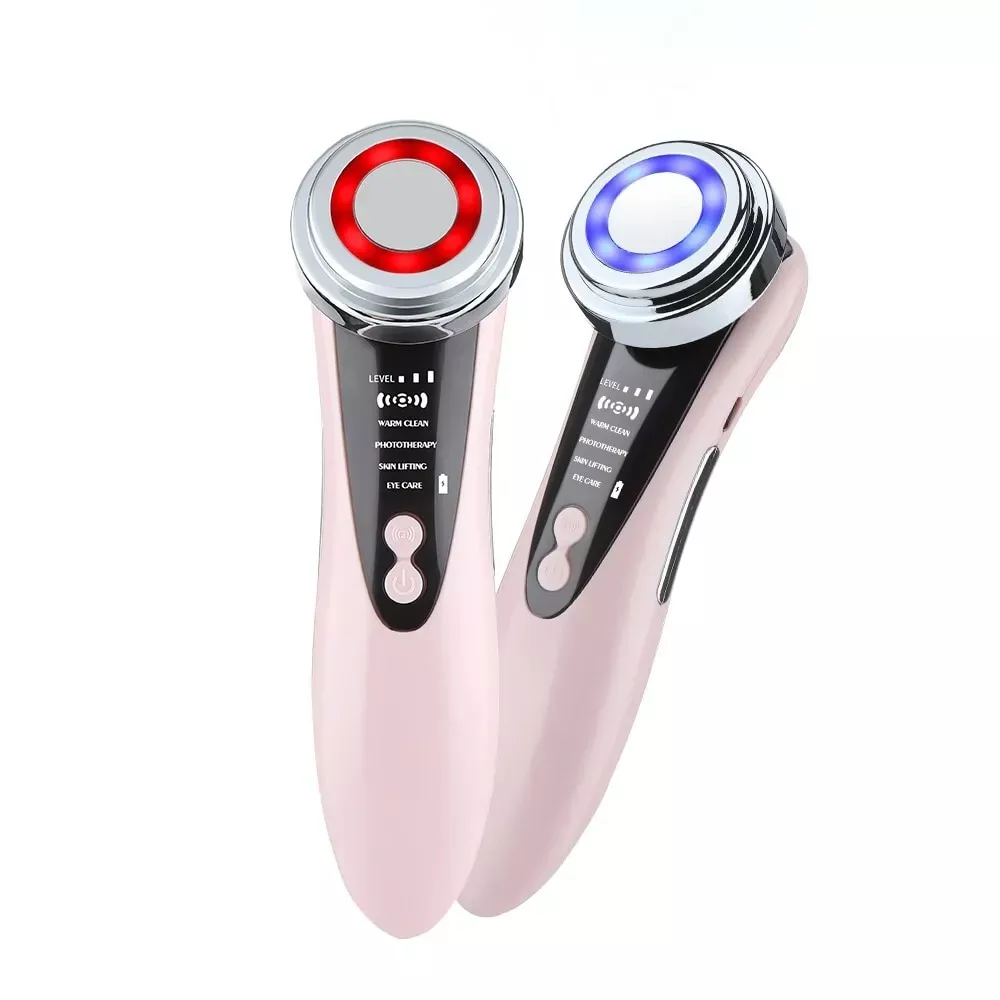 The 5-in-1 multi-functional facial skin care massager is a cleansing and rejuvenating device. Device for facial care with galvanic ionization, heating, micro vibration and phototherapy with red and blue light. The massager promotes deep cleansing, rejuvenation and lifting of the face.