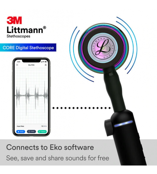 The 3M Littmann CORE Stethoscope works with Eko software on iOS and Android devices, giving you a HIPAA compliant means to save and annotate 15, 30, 60 or 120-second recordings in a secure dashboard. Create a library of heart sounds to monitor the progressions of a disease or for education, and securely share recordings with colleagues.