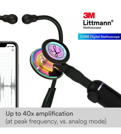 The FDA-cleared 3M™ Littmann® CORE Stethoscope toggles between analogue and amplified listening modes so you can listen how you want to during assessments. Tuneable diaphragm technology—a 3M invention—lets you hear different frequency sounds by simply adjusting the pressure on the chestpiece. Hold the chestpiece with light pressure on the patient to hear low frequency sounds; press a little more to hear higher frequency sounds. Soft-sealing ear tips conform to individual ears for optimal comfort and excellent sound occlusion.